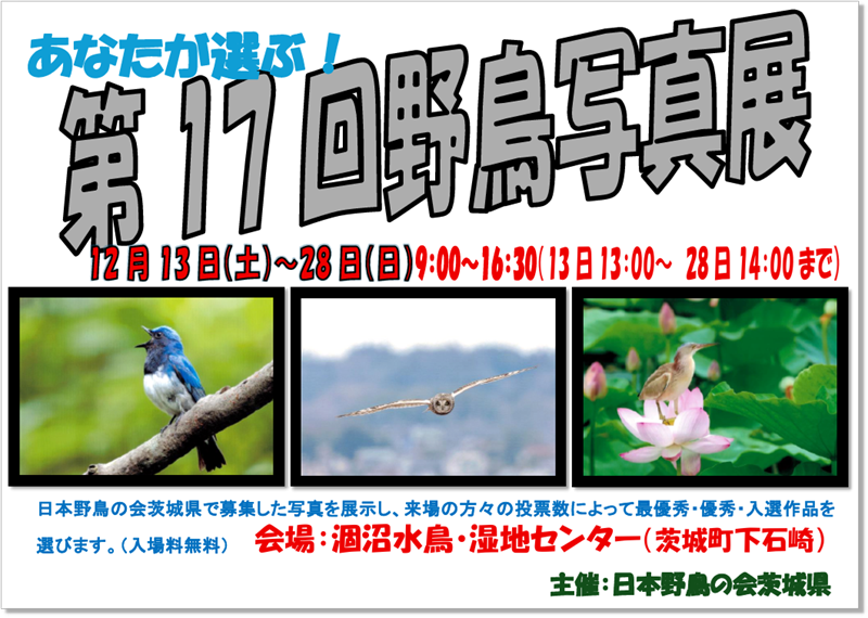 12月13日(土)から、茨城町の涸沼水鳥・湿地センターにて、会員の方々の応募作品による野鳥写真展を開催します。